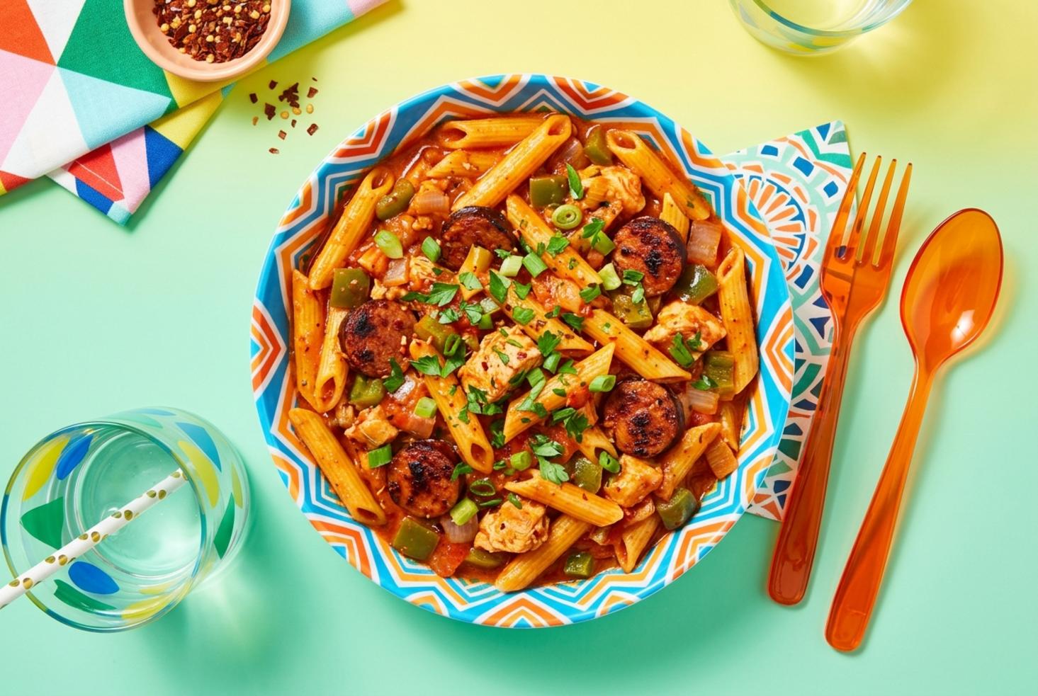 A one-pot Louisiana classic featuring smoky sausage, Creole spices, and tender penne in a spicy tomato cream sauce.