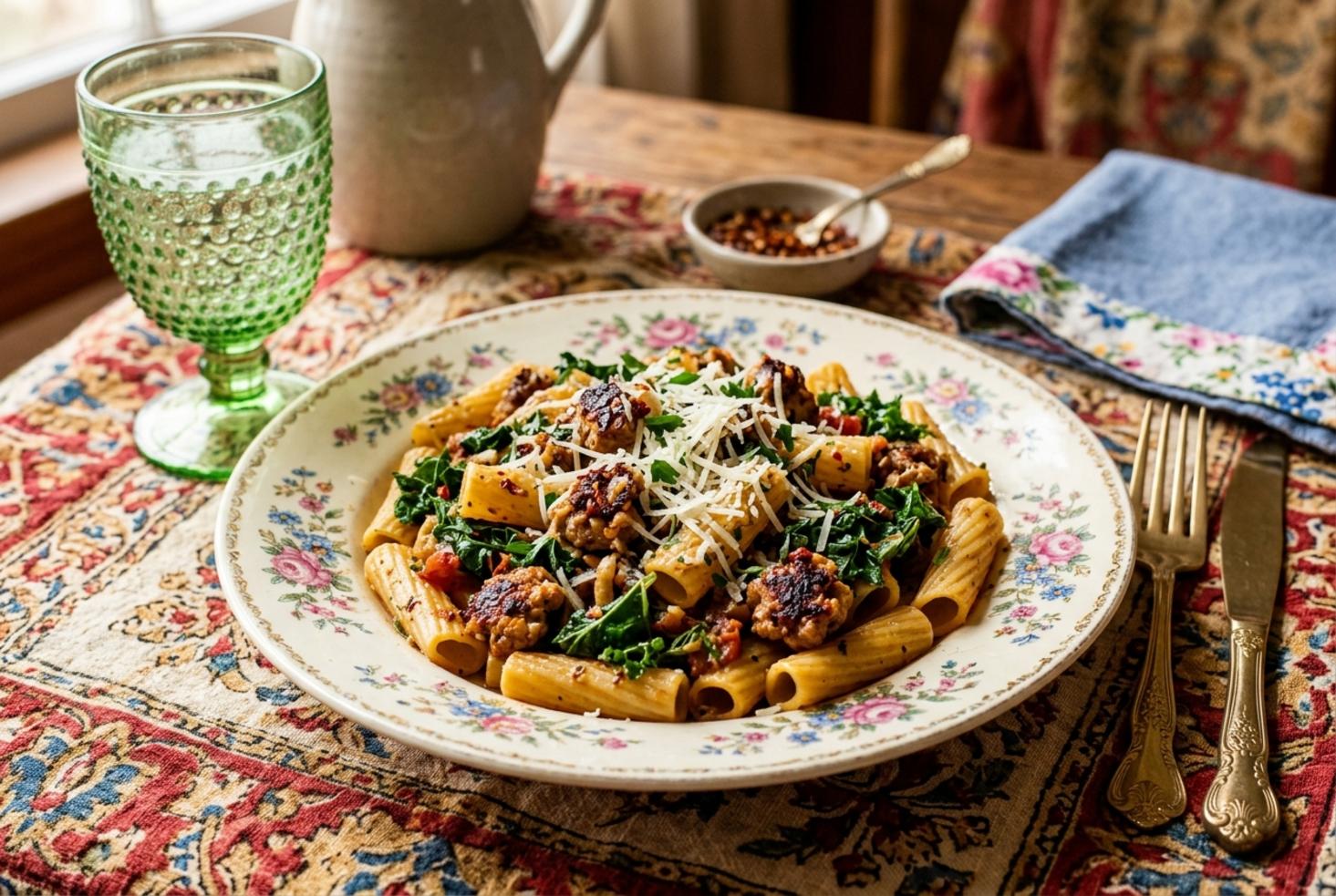 A quick skillet pasta sauce featuring browned spicy chicken sausage, wilted kale, and sharp parmesan. Heat builds gently while greens stay crisp and tender.